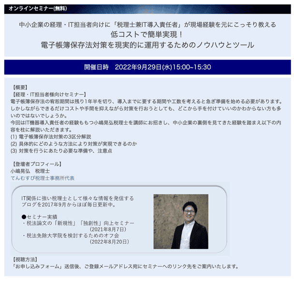 2022年9月29日(水)15:00~15:30から、電子帳簿保存法を低コストで実現するためのセミナ...